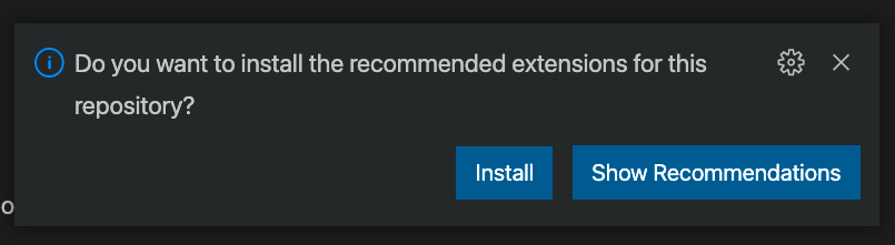 When you open the project, some pop-ups may open asking if you’d like to install the project-recommended plugins, make sure to accept these plugins by clicking Install as this will set your editor up with all the required intellisense/linter plugins required for the project.